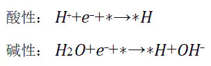 Volmer步骤(吸附):质子吸附至催化剂活性位点形成*H中间体:
