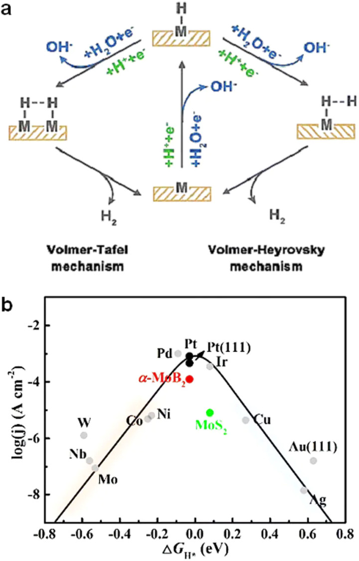 HER是一个复杂的多步骤反应,涉及电子转移、离子迁移和表面化学反应。其整体性能受到多种因素的影响,包括催化剂的性质和电解质的环境。HER过程通常通过Volmer-Heyrovsky或Volmer-Tafel机制进行。HER的两类主要反应机制: